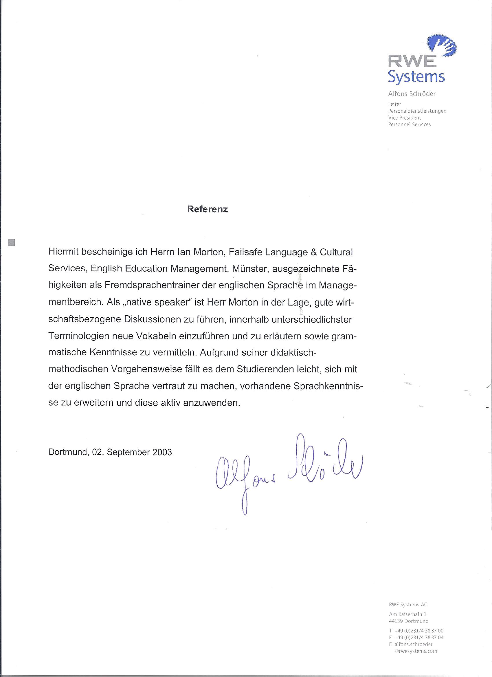 09 / 2003 RWE Systems (Leiter Personaldienstleistungen) Dortmund